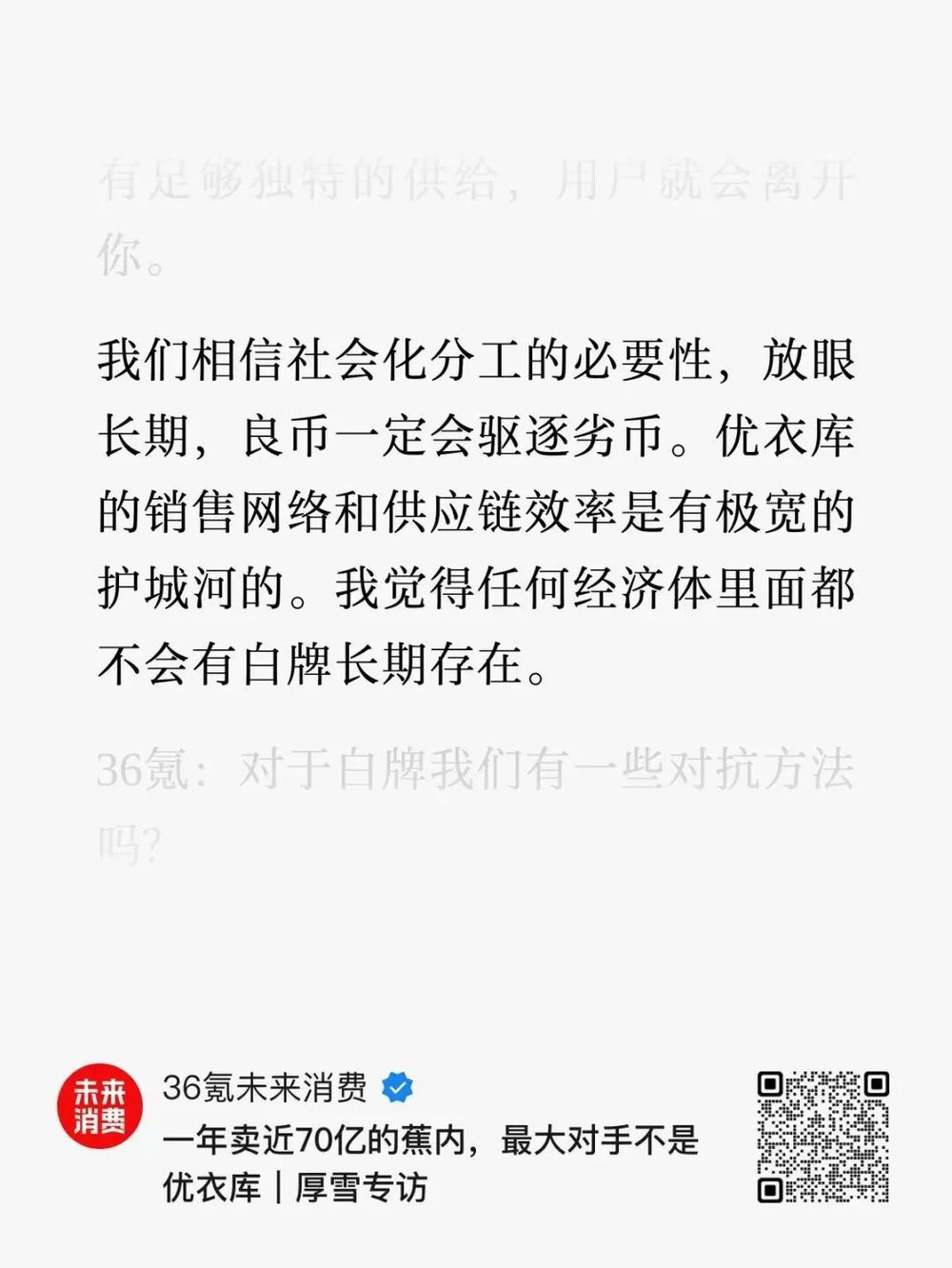 我昨晚研究蕉内这家公司,他的创始人言论就给我一种不尊重科学、不讲逻辑的感觉,如下图,他说“蕉内最大的对手是白牌,因为产能过剩,再加上整体下行的经济环境,大多数人消费降级,就很容易对我们形成冲击。我觉得任何经济体里面都不会有白牌长期存在”。