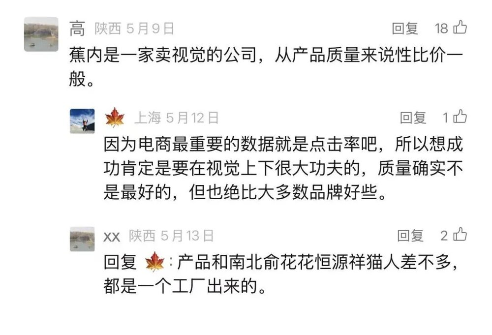 消费者心中有杆秤,并不是说服装、生鲜非标,不能直接比价,他们就感知不到差异。下图的消费者评价是客观的:蕉内是一家依托于淘宝流量红利做出来的淘品牌,擅长的是设计美感与广告营销,并没有在供应链上做创新,试图发明一套“体感科学”的东西让消费者付出更贵3倍的价格,129块3条内裤。中国这类型的品牌,能够满足一小部分价格不敏感的人的价值主张,他的稳态不会是 50 亿销售额,只会是 10 亿左右。
