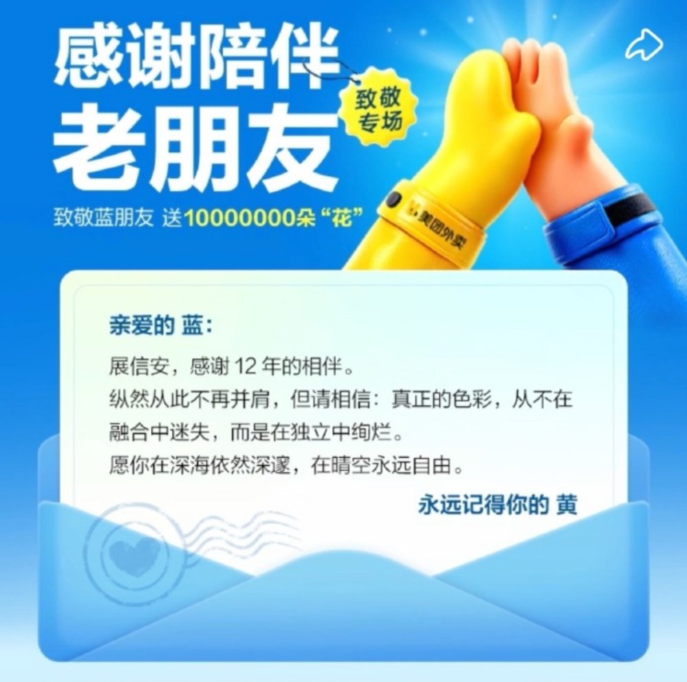 当然,也正是因为频繁地调整与屡战屡败,让饿了么失去了独立的能力,后来的整合变得更加容易。怀旧的人不多,反而是老对手美团,或真心或玩梗地发文来“悼念”。