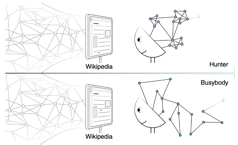 • “猎人(hunter)”:聚焦紧密相关的主题,频繁回访相似内容,形成高度聚类、路径较短的”紧密型网络”。