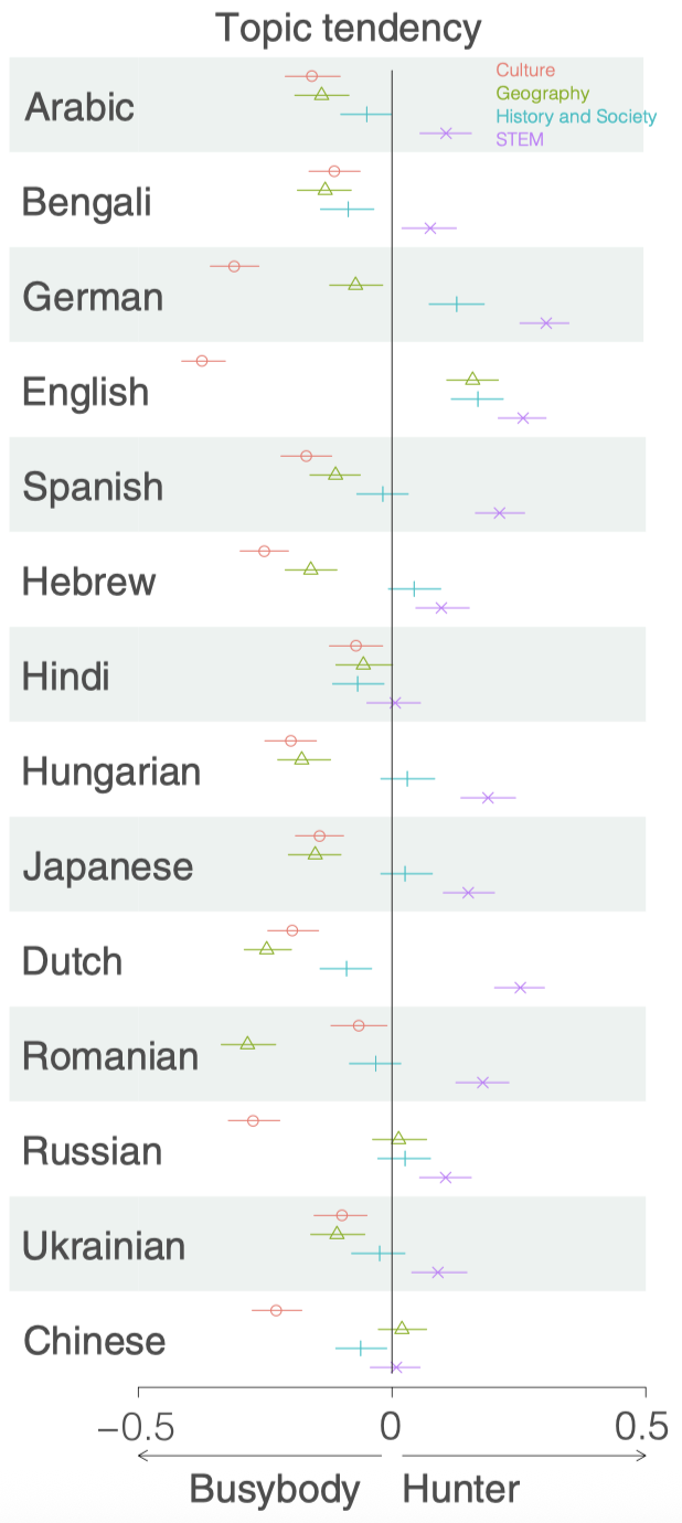 大规模的跨文化数据提供了一些非常有意思的细节。例如,在浏览网页时,猎人们更偏好STEM内容,好事者们更喜欢文化、地理主题,舞者们则无固定的主题偏好。在阿拉伯语、孟加拉语、印地语、荷兰语、中文等语言的用户中,好事者对“历史与社会类”文章的访问比例更高,且主题偏向“广泛的社会文化”(如“民俗”“教育体系”);德语、英语等语言中,猎人对“历史与社会类”文章的访问比例更高,且主题偏向“特定历史事件或制度”(如“二战”“总统制”)。