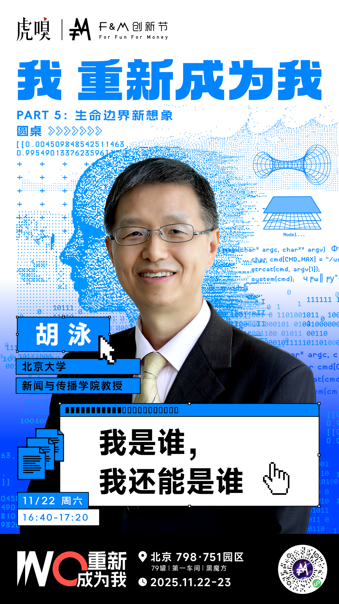 北京大学新闻与传播学院教授胡泳,将参与圆桌《我是谁,我还能是谁》的探讨。当AI不仅能模仿思维,更开始介入创造、情感乃至社会关系,它挑战的已不仅是身份认同,更是“生命”本身的定义。胡泳将从传播与社会的视角,探讨在算法与肉体交融的时代,生命的边界与尊严何在。
