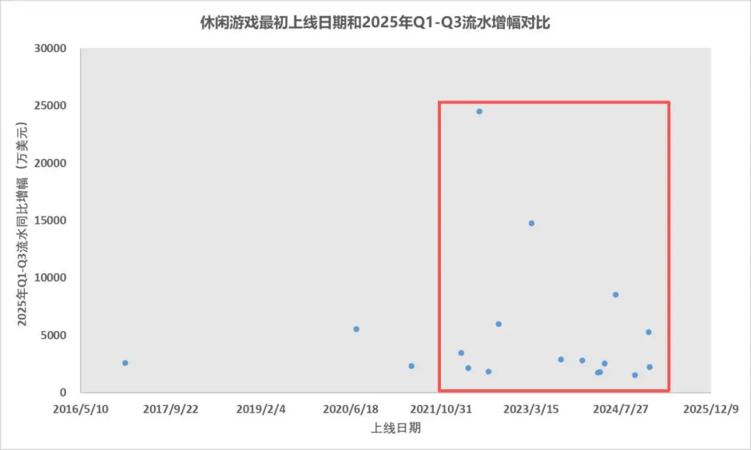 3. 根据总体数据情况,本文以1500万美元作为流水同比增幅标准(约合1.07亿人民币),选取了2025年Q1—Q3流水增幅Top 18休闲产品进行分析比对。