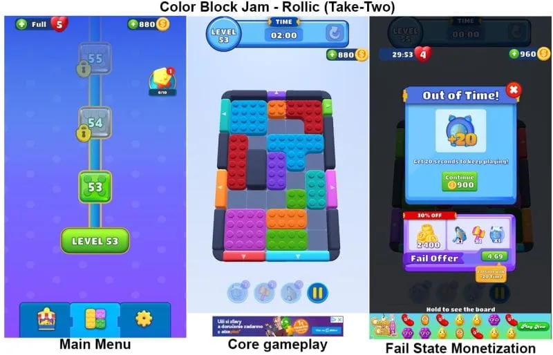 以混休游戏为例,“Color Block Jam”的基础玩法其实非常简单,就是华容道。然而Rollic可以将机制的核心基础——推拉积木块操作保留,再把玩法变得足够直观,然后再结合传统休闲游戏的数值控制经验,最终让游戏既能吸引新玩家也能让玩家付费。笔者玩下来感觉不论是一步步介绍机制,还是逐渐引入付费道具,都很丝滑。以至于到了难度真正比较高需要付费或者看广告的节点也感觉很自然。