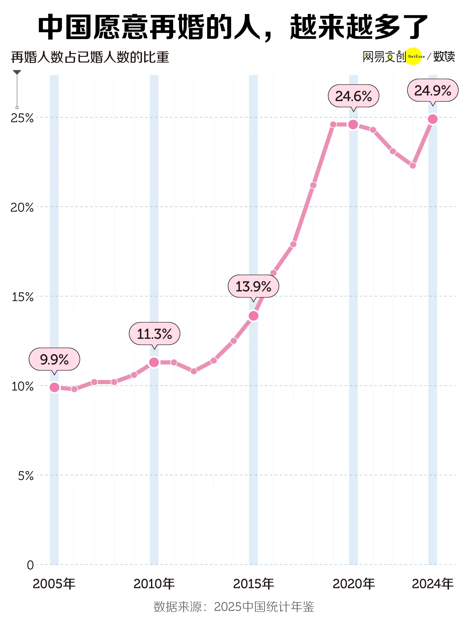 根据历年《中国统计年鉴》,过去 20 年,中国再婚人数占已婚人数的比重不断上升,2005 年还不足 10%,到 2024 年已经达到 24.9%。换言之,现在每四个登记结婚的新人里,就有一个人不是第一次领结婚证了。