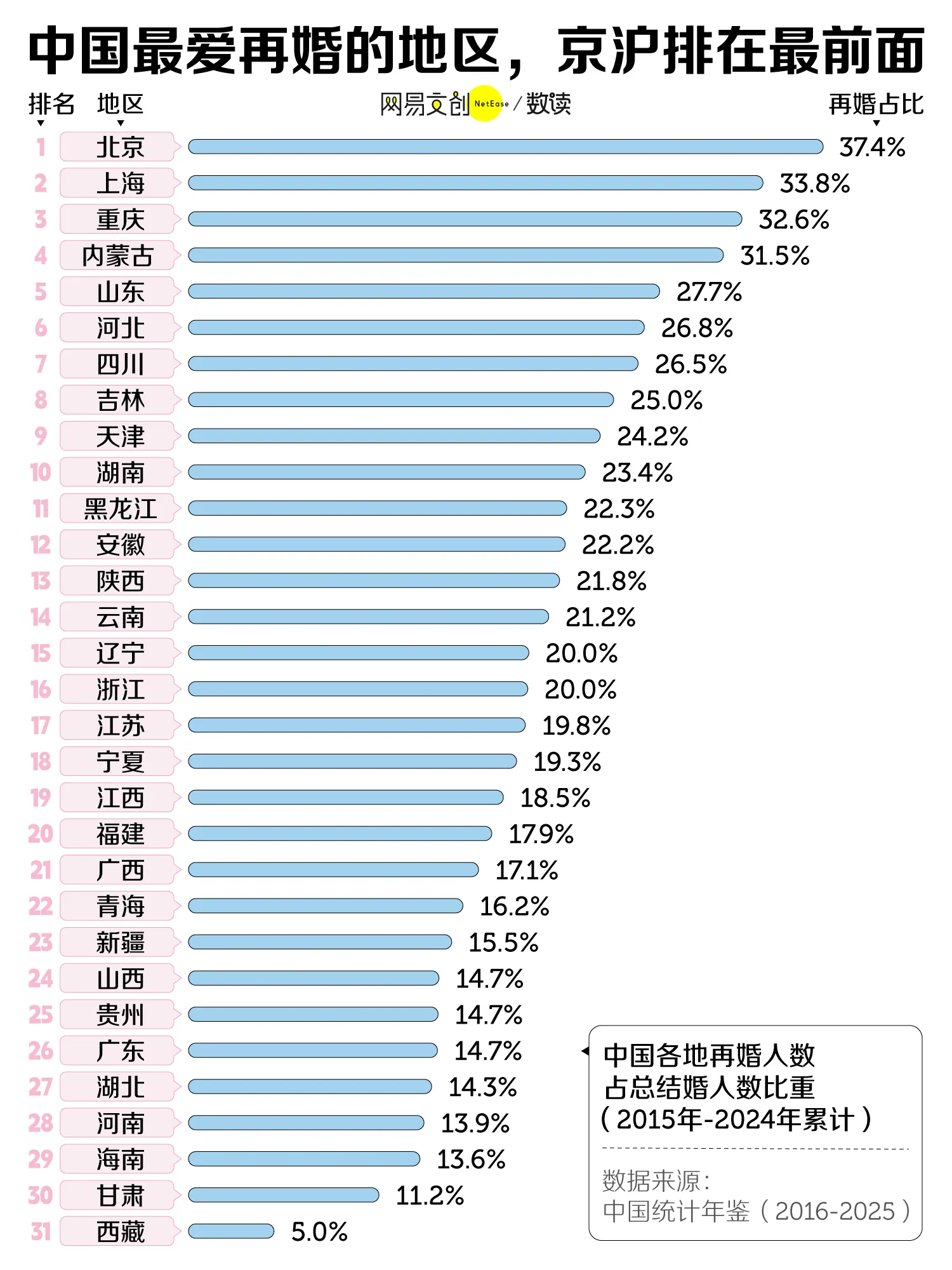 北京、上海、重庆是典型例子,过去十年的再婚人数占已婚人数比例超过三成,远高于全国平均水平。他们对婚姻失败的“脱敏”速度更快,也更敢重新组建家庭。