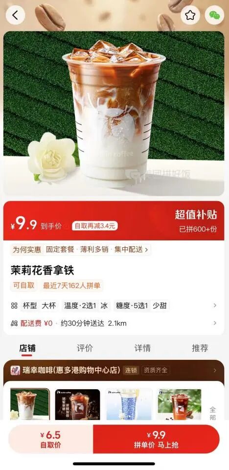 外卖战最激烈时,在美团拼好饭,用户外卖买一杯生椰拿铁要6.9元,自提一杯仅需3.5元。而这3.5元,瑞幸虽然无需向平台支付配送费,但仍需按比例缴佣,盈利无疑比过去的普通门店自提低了不少。