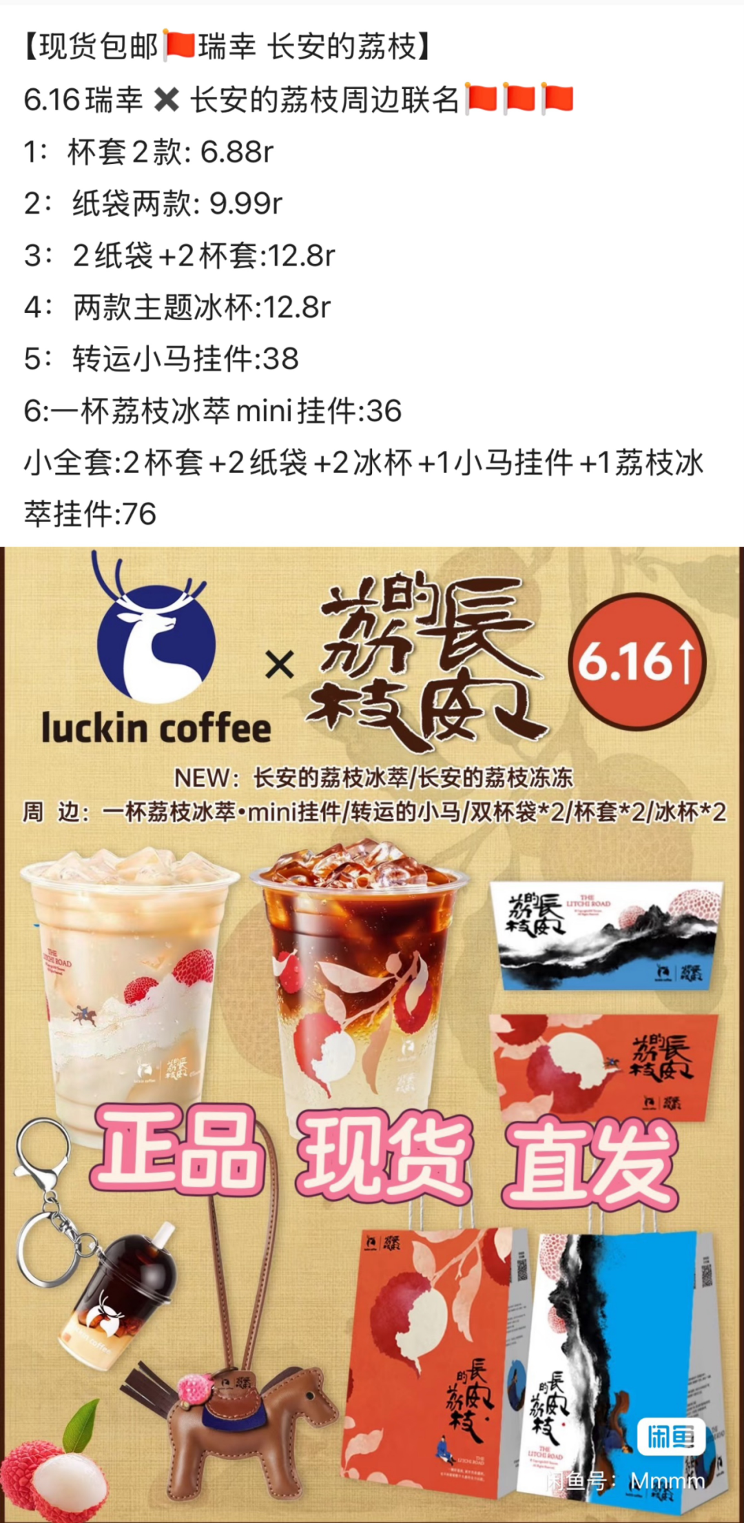 举个例子,今年Q2,瑞幸继续依赖IP联名和代言人策略强化产品心智。与热播剧《长安的荔枝》合作推出“荔枝冰萃”等新品,首周销量突破850万杯,联名周边在闲鱼被热炒。这类产品的持续强劲表现,才让瑞幸有了不陷入外卖价格战的底气。