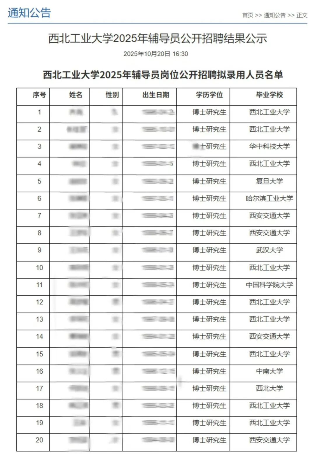 近年来,高校辅导员“全员招博士”的现象屡见不鲜。2025年10月,西北工业大学公示辅导员岗位公开招聘拟录用人员名单,20位均为博士研究生,其中90%毕业于985高校。