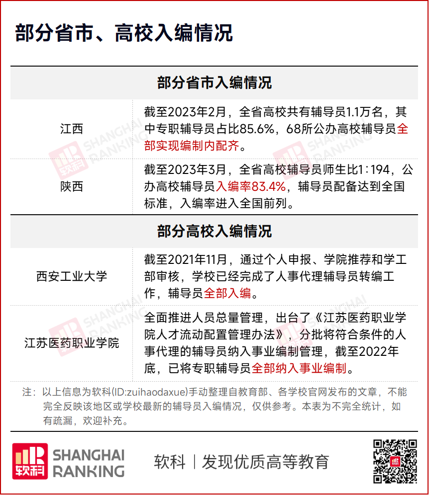 2020年,江西形成了《江西省公办高校专职辅导员编制落实工作方案》,专门拿出1200个编制,用于解决专职辅导员的编制问题,并提出在三个月内“公办高校专职辅导员在编比将达100%”的目标要求。截至2023年,68所公办高校辅导员全部实现编制内配齐。除江西外,江苏在《2020年高校思想政治工作重点任务清单》中明确2022年度专职辅导员进入事业编制比例达到100%。
