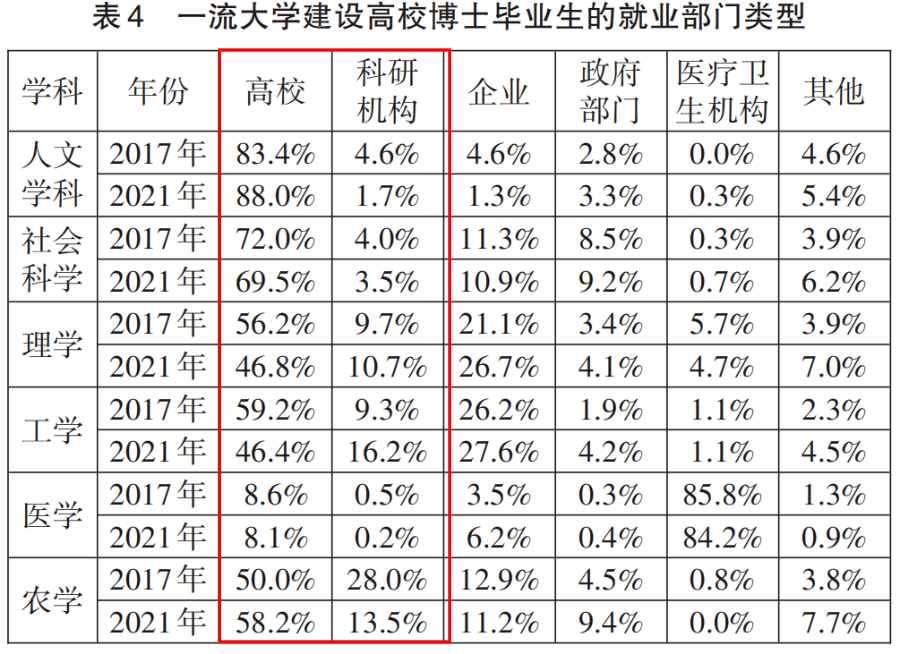 统计数据显示,目前我国顶尖研究型大学博士毕业生在高等教育单位的任职比例已低于50%。北京大学教育学院副教授沈文钦在一项调查中发现,近些年我国博士毕业生进入学术部门(高校和科研机构)的比例在下降。结果显示,在首轮世界一流大学建设高校中,除了人文学科外,2021年其余学科博士毕业生的学术部门就业率,与2017年相比下降了0.8~8.4个百分点不等。