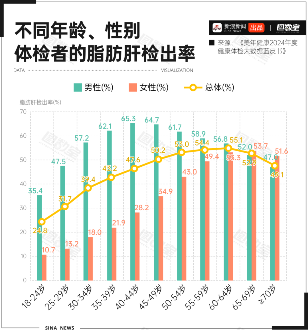 一项千万级体检数据报告显示,中国人脂肪肝检出率为45.1%,其中男性检出率为57.6%,远高于女性的30.9%。从年龄来看,中年男性和老年女性脂肪肝是最高的。