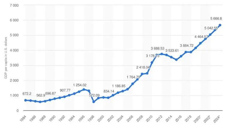 2015年后,印尼人均GDP继续保持高速增长 数据来源:Statista