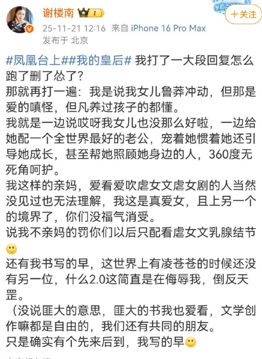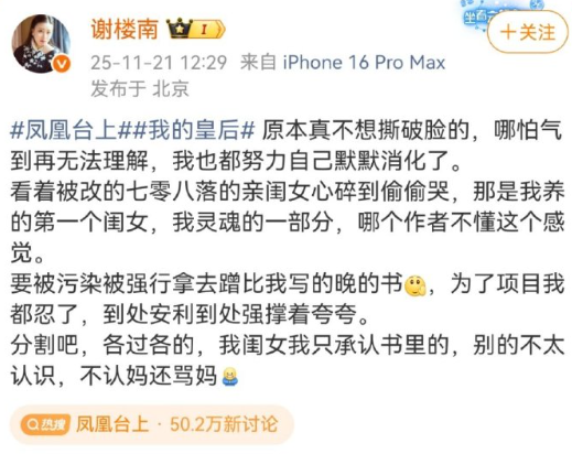 《东宫》原著一直被视为“虐女文学”的代表,而谢楼南自诩“爱女”“女主亲妈”,在女频界可以说是相当权威,不愿与“虐女”二字扯上关系,更不愿两部剧拿出来作对比。