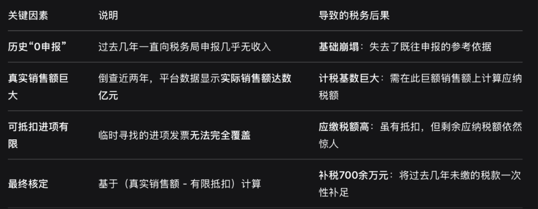 由于过去几年一直做“0申报”,面对突然被翻出的数亿元销售额,阿强尽管竭力寻找进项发票抵扣,也尝试托人沟通,最终仍被核定需补缴超过700万元的税款。