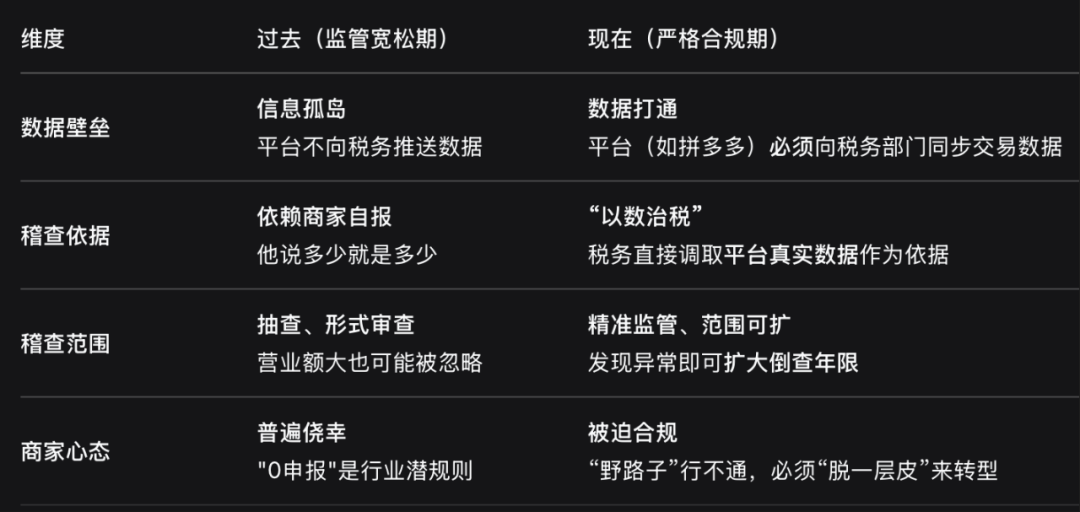 他透露,过去中小电商卖家普遍不缴税,几乎是行业“潜规则”。“早期哪有电商税这个概念?我们身边做拼多多的,几乎全是0申报,没人查。直到政策出来,平台才开始向税务局同步数据。以前平台不报,税务根本不知道你实际卖了多少钱。”