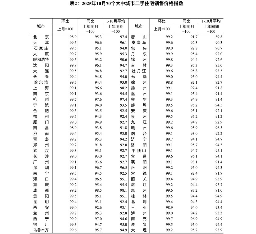 2025年10月,70个大中城市二手住宅销售价格指数/图源:国家统计局