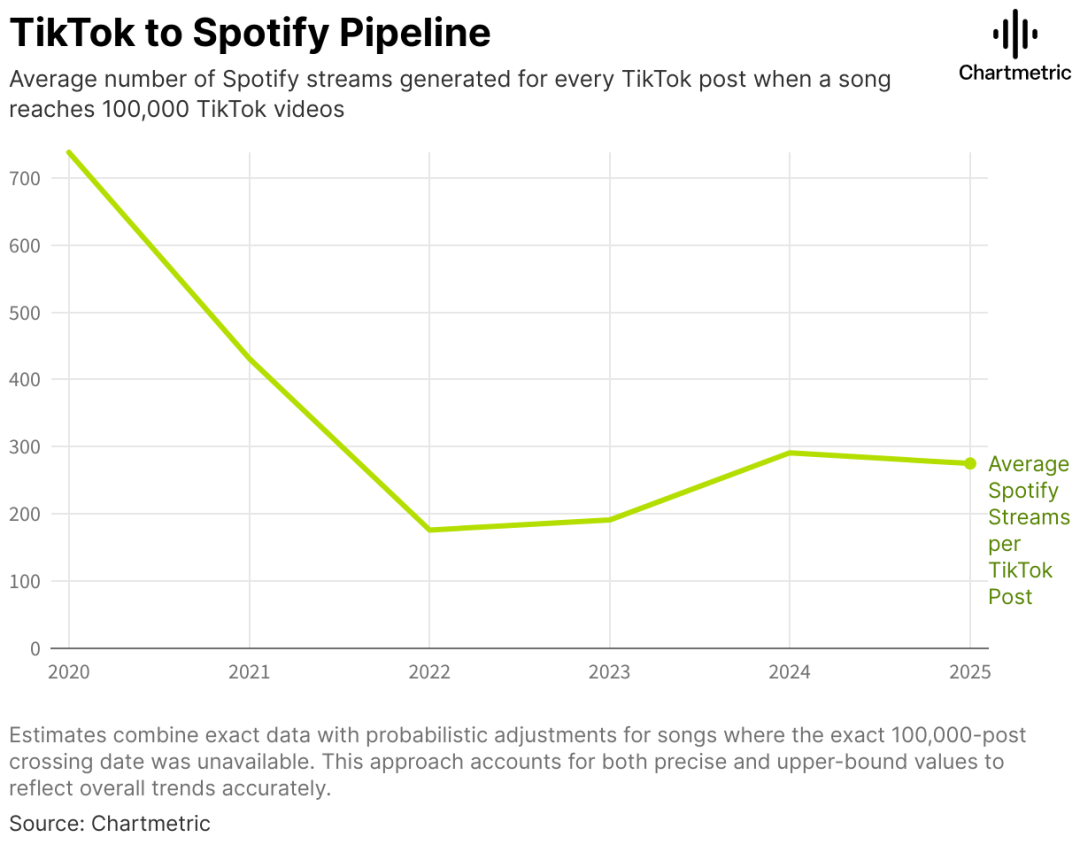 根据Chartmetric数据,在2020年,一条TikTok视频,大概约等于738次Spotify播放;而到了2025年,一条TikTok视频,大概约等于275次Spotify播放。