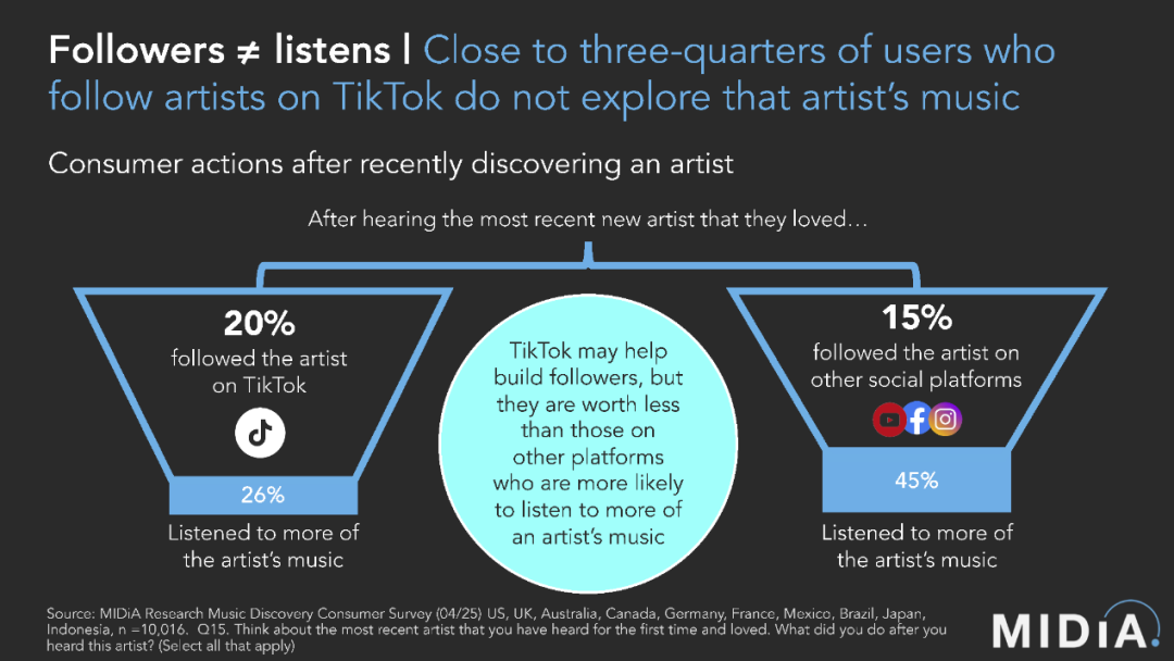 报告指出,在用户发现一位新艺人之后,只有20%会选择在TikTok上关注,而进一步真正去听这位艺人更多音乐的比例只有26%,意味着四分之三的TikTok 粉丝停留在“刷到”的层面,从未进入实际的音乐消费环节。