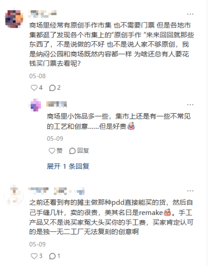 “再也不想付费逛国内的市集了。”网友“幸运托马头”去了一个需要购买门票的中古市集,发现市集上的商品是流水线产品后发帖质疑。随后,商家联系了她,予以退款并表示“请您删帖,立刻”。她认为,市集既向摊主收取摊位费,也收了消费者的门票钱,两边都花了钱,却连基本的原创设计都保证不了,筛选机制有待提升。