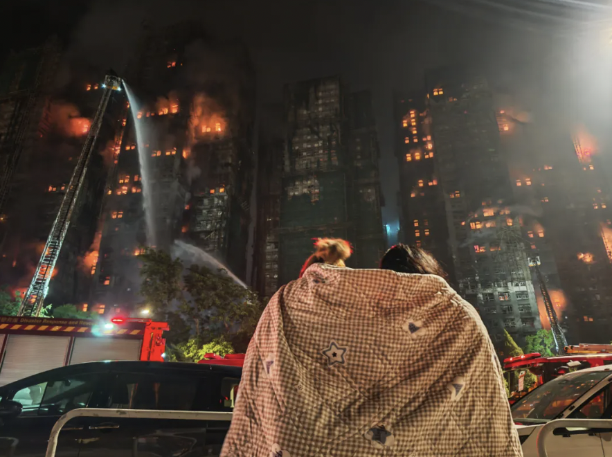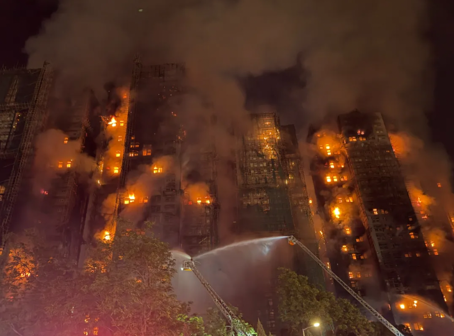 香港新界大埔宏福苑,一个有1984户、四五千人的住宅区,楼龄已42年,原本正在开展外墙维修工程,却在11月26日下午2点51分遭遇一场夺命大火——火焰从宏昌阁外墙棚架低层燃起,借着风力裹挟着燃烧的塑料布、保护网,迅速向31层高的楼栋攀升,更蔓延至小区另外6栋楼宇,仅三小时内便从初始火警一路升级为香港自2008年以来的首次五级火警。