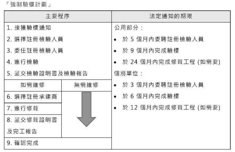 强制验楼计划规定,楼龄达30年或以上的私人楼宇(不超过3层高的住用楼宇除外)的业主在接获屋宇署发出的法定通知后,须委任一名注册检验人员就楼宇的公用部分、外墙及伸出物或招牌进行订明检验。如该注册检验人员认为楼宇有需要进行订明修葺,业主须委任一名注册承建商,在一名注册检验人员的监督下进行所需的订明修葺。