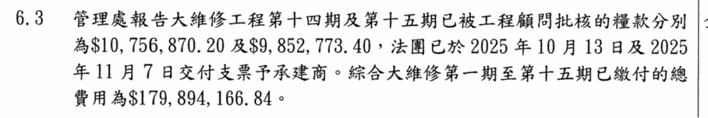 根据宏福苑11月7日最近一次业主立案法团的会议记录,目前进行的大维修共进行了15期,总工程款为179894166元(1.8亿)港币。