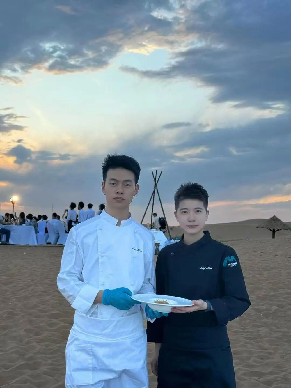 外宴的训练让屈雨瑜变得更“稳”。在内蒙古乌兰布和的沙漠晚宴期间,她和团队驻扎了整整60天。两个月内,他们每隔几天就要做一场外宴,总共服务了近3000位客人。第一场外宴便遭遇了沙尘暴——风把纸巾、菜单、牙签等物品卷得满地飘散。他们只能在风沙里搭起临时厨房,紧急清理现场。