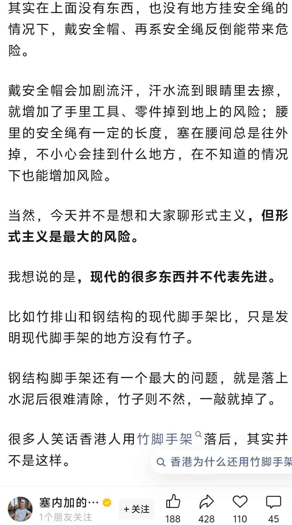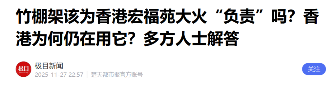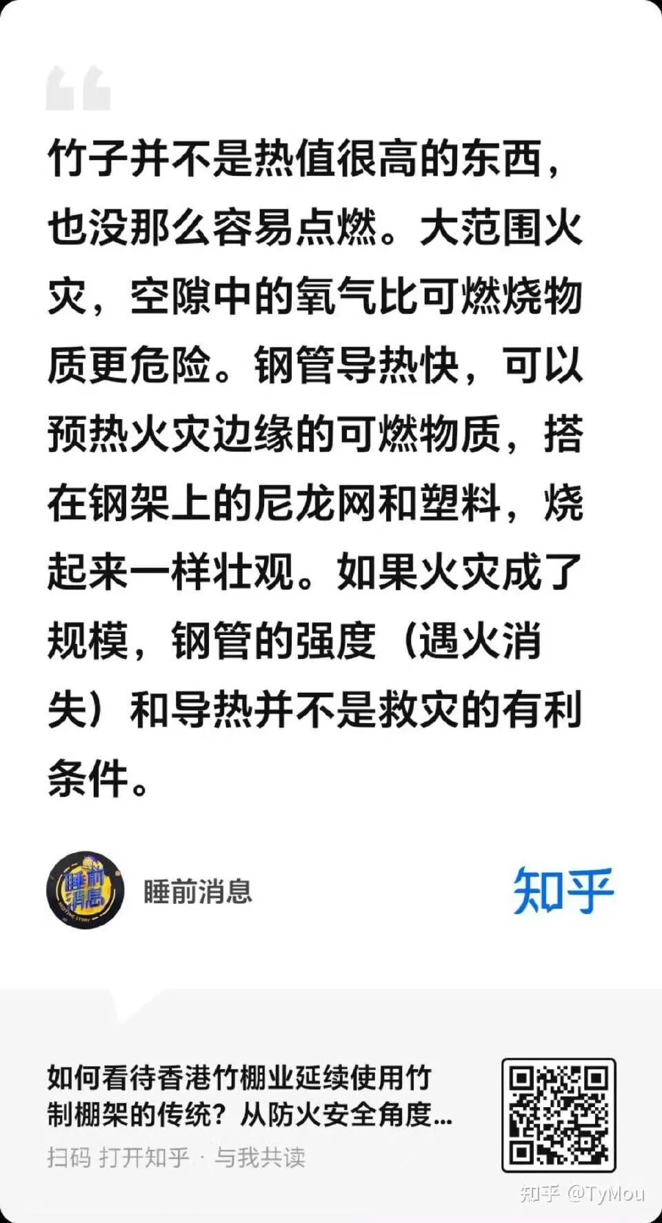 火灾无情。灾难的发生很多时候都是多方面原因造成。同样,想要尽可能地预防灾难,也要从多方面综合入手进行治理。但这前提也是需要能有效治理,就像香港建筑行业的情况一般,以香港今日行会社团法团遍布,而港府相对于这些存在又居于弱势的局面,有效的治理和预防到底能从哪开始,才是问题所在,不然再怎么论证竹制脚手架安全先进也于事无补。这也是我们需要保持思考和警惕的。