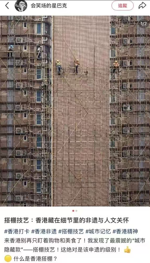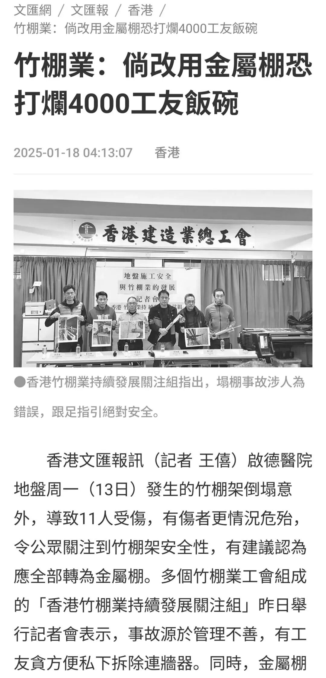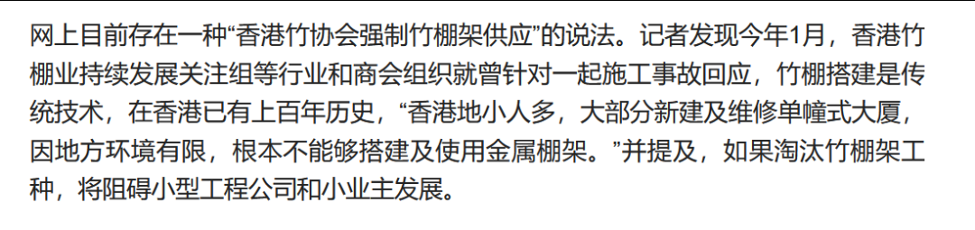 在维修过程中,施工方使用了香港当地特色的竹制脚手架“棚架”。竹制脚手架在祖国内地已经因火险隐患和无法抗拒剪切力等安全问题,在2000年前后在正规工地中全面禁用,仅少量存于农村自建房工程。然而,在香港地区,棚架商会长期垄断脚手架施工行业,以“传统技艺”和保护从业人士避免失业等借口,抵制金属脚手架的推广。今年年初,棚架工会还再次发文陈情。