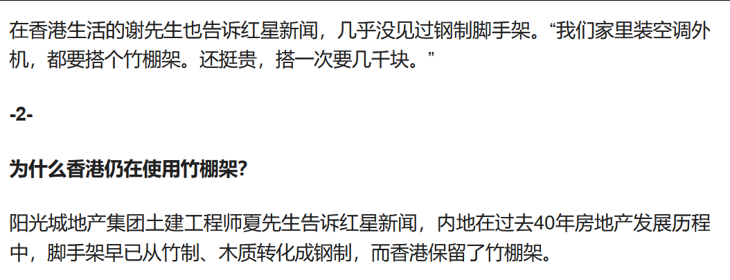 火灾发生后,舆论马上就引发火灾的竹制脚手架展开讨论。大陆网友普遍认为到了今天香港还在使用竹制脚手架、还存在相关材料的“行会”,施工阻燃标准落后等问题很不合理;同时,也有一些声音为竹制脚手架的存在辩护或试图将锅甩给“中资”和“外劳”,还有大V说竹子不易燃,以及其他一些清奇的辩护角度。