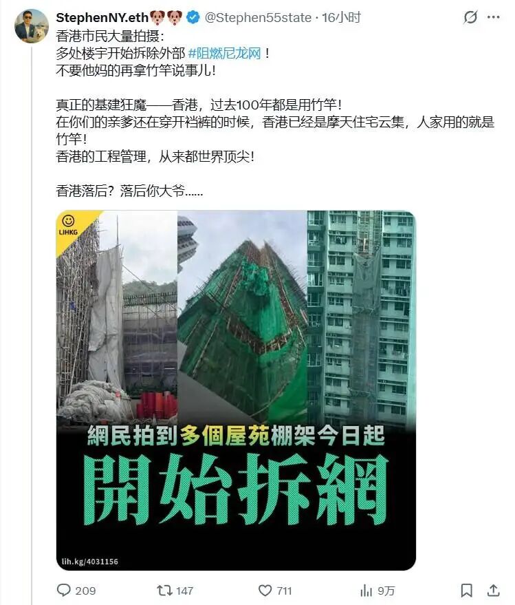 据宏福苑业主反应,2024年维修施工开始不久,他就发现棚架上使用了易燃的“棚网(绿布)”。如果按照祖国内地的国标采购阻燃棚网,花销要高一倍以上。该业主当即向业主立案法团和香港劳工处等官方部门投诉。然而,法团主席、区议员等体面人物均向业主们担保棚网的安全性,劳工处也以官方名义回复,说香港当地没有棚网阻燃的相关要求。直到今天(28日)的最新消息,根据今天港府有关部门对棚网的初步化验,发现达到阻燃要求。