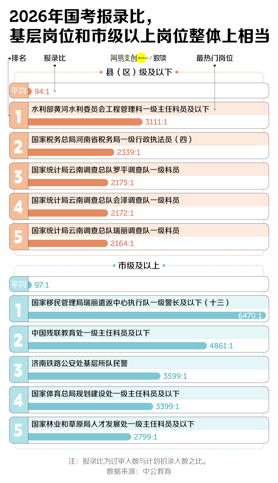 2026年国考,市级以上岗位的报录比为97:1,略高于县(区)级及以下机构岗位的94:1。同时,一些市级以上的岗位过于抢手:在报录比超过3000:1的岗位中,县区级只有1个,而市级以上就有4个。