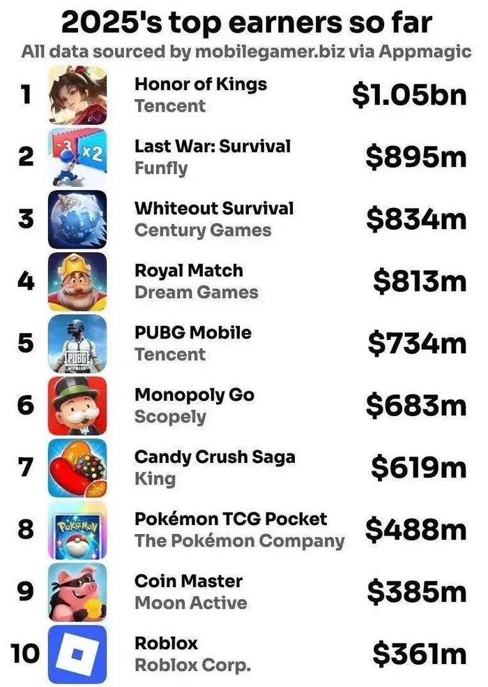 因为数据提供了无可辩驳的证明:全球游戏收入排行榜榜首长期以来都是同一个游戏——MOBA游戏《王者荣耀》。(下图)
