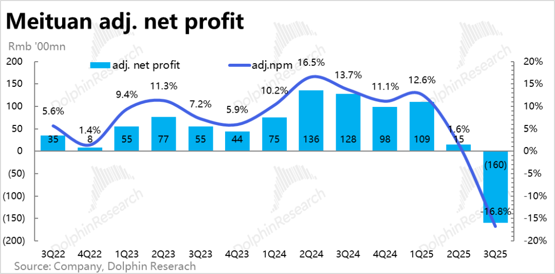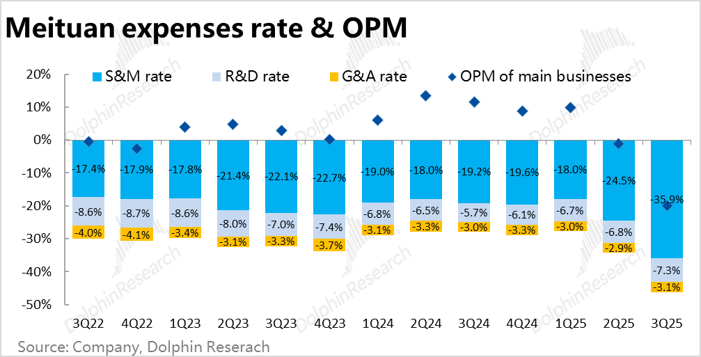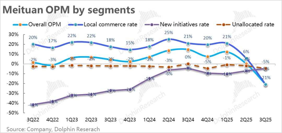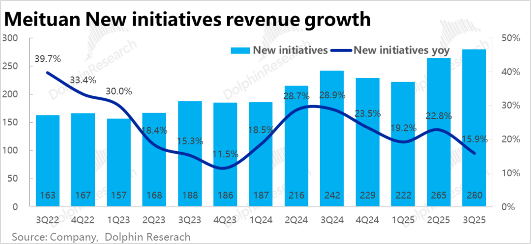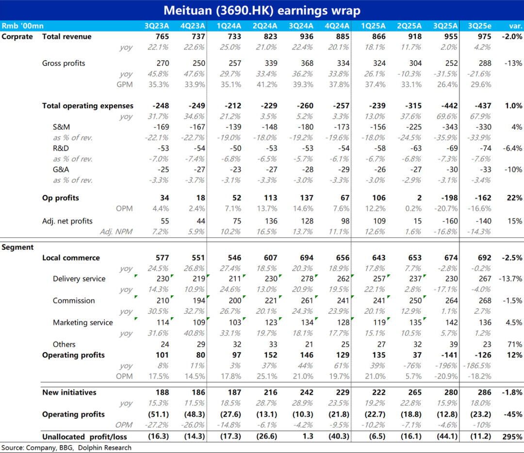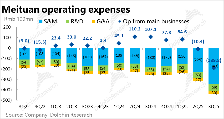 让人意外的是,本季新业务的亏损环比不增反降,本季亏损12.8亿元(vs.上季18.8亿)。考虑到海外Keeta和闪购前置仓在投入期的亏损反而减少,再结合业务收入增长的放缓,很可能是优选、小象超市和如快驴等其他业务的收缩力度都比预期的更高。