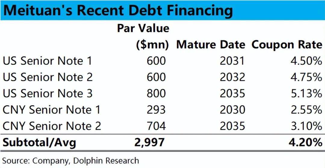因此,美团在11月初接连发行了5只合计近30亿美元的优先票据,以此补充能继续投入在补贴和其他业务发展上的“资金弹药”。如下表,本次发行票据的加权票息率约4.2%,简单测算,因此产生的年利息成本近9亿元人民币。