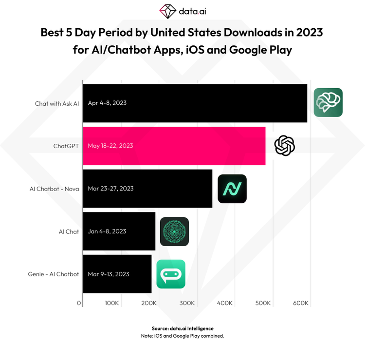 2023年4月,一个叫Chat with Ask AI的App上架iOS商店,比OpenAI官方的ChatGPT App整整早了一个月。仅凭名称占坑,这个App首周就拿下了59万下载,等到官方版上线时,它还压着ChatGPT排在免费榜第一。