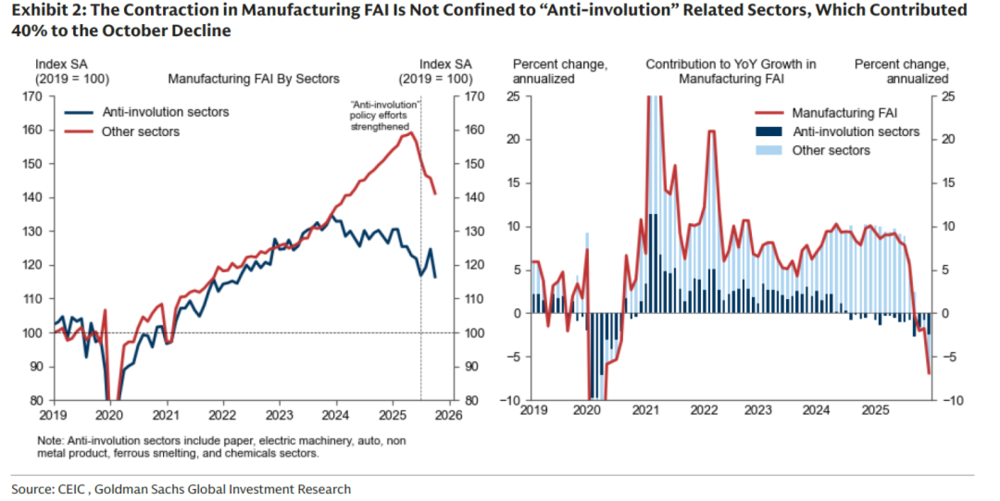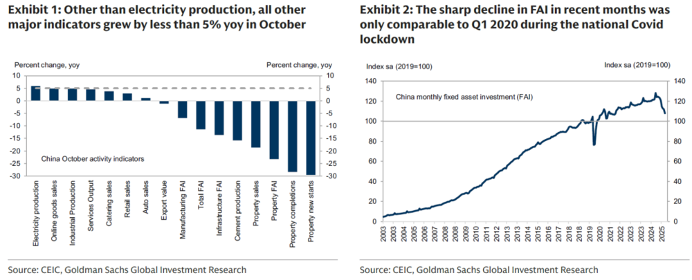 下图左:10月份几乎所有高频经济数据都出现下滑,没有多少超过5%的经济体整体增速。右:固定资产投资(FAI)增速的下滑仅有2020年1季度可比,而当时正是疫情的开端。