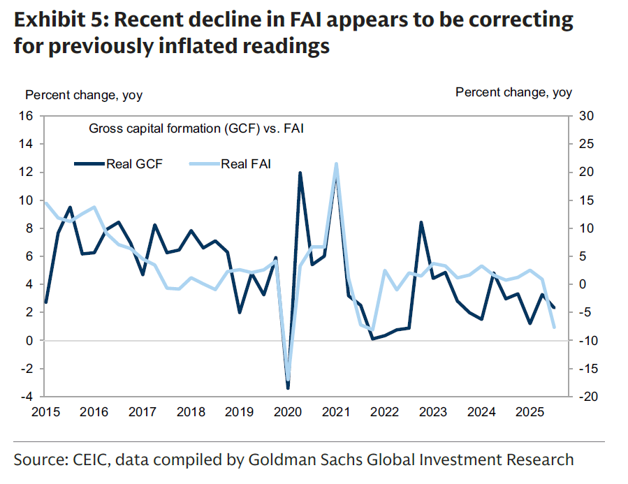 同样,在制造业,受反内卷影响的行业按道理应该对投资下滑贡献更大,但实际上近几个月没有受到反内卷波及的行业贡献了大部分跌幅。根据推测,这意味着统计口径和数据的有意调整。换言之,前几年没有充分体现实际情况的数据,在逐步拨乱反正。