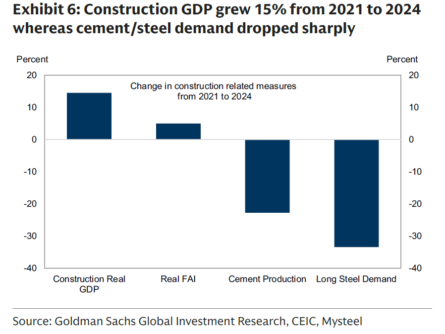 高盛中国经济团队非常系统性地将固定资产投资分为制造业、基建和地产,并且在每一个分项上找到基本面能够解释和无法解释的部分,将后者归因于挤水分。超过一半的下滑幅度来自水分排出。