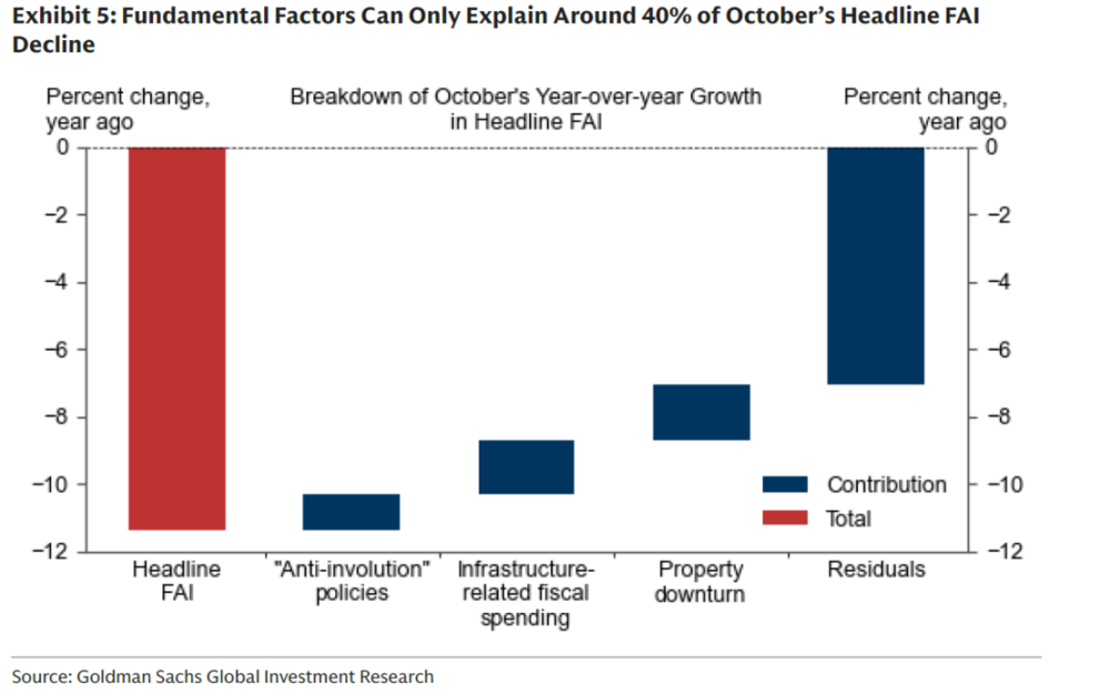 从公布结果来看,年初以来,固定资产投资增速连续下降,10月份惊人地下滑到了-11%以上。但高盛和美银均出了报告,对此进行解释。