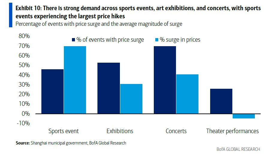 美银统计了体育赛事、艺术展览、演唱会的强劲需求。以上海为例,涨价的活动比例和涨价幅度都是极高的。演唱会有7成涨价,涨价幅度平均达到4成。