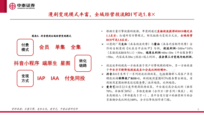 根据中泰证券的报告,以发行方友和与酱油动漫合作的《玩具店开出机甲》为例,其盈利逻辑清晰可见。当投流ROI是1.1时,投流利润=300万元×(1.1-1)=30万元;端上原生利润扣除60万元总成本和10万元平台服务费后,还能赚50万元,合计80万元。而整部漫剧的内容成本仅30万元,远低于投流利润与端上利润之和,剩余的第三方变现(如品牌植入、周边授权等)则全部为纯利润。这一案例也印证了发行方通过精细化投流和渠道运营,能为漫剧项目带来稳定的收益空间。