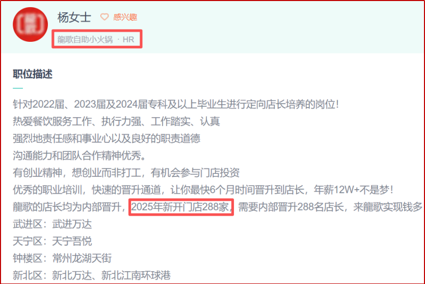 而根据公司在BOSS直聘上的招聘信息,龍哥自助小火锅要在2025年新开288家门店。