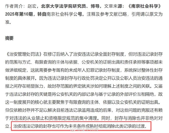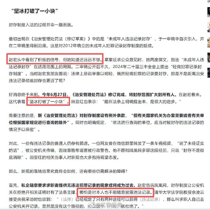 现在的问题是,既然未成年人的刑事犯罪记录都可以封存,那么相对违法程度较轻的治安管理违法为什么不能封存。这也是2023年推动修订《治安管理处罚法》相关条款的直接原因。在一开始的草案中,第136条本来只限定为未成年人记录封存,只不过在最终的立法博弈中被扩大化。并且最终在二十届三中全会明确提出“建立轻微犯罪记录封存制度”后,在三审中确立将封存对象扩大到所有自然人。