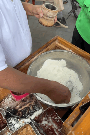 如果你爱干爽的米香,熟梨糕应当是你喜欢的风味。这是一种类似南方“冲冲糕”的米粉糕,木头模子放到高压蒸锅的气口上,蒸汽会打出“werwer”的响声,所以也叫“werwer糕”。werwer糕的吃法一般是在顶端加红糖或者各种果酱,但在内部填巧克力酱的做法已经是越来越寻常。糕的质地带一点“沙”,恰被巧克力酱“黏”在一起,层次感真是妙极了。