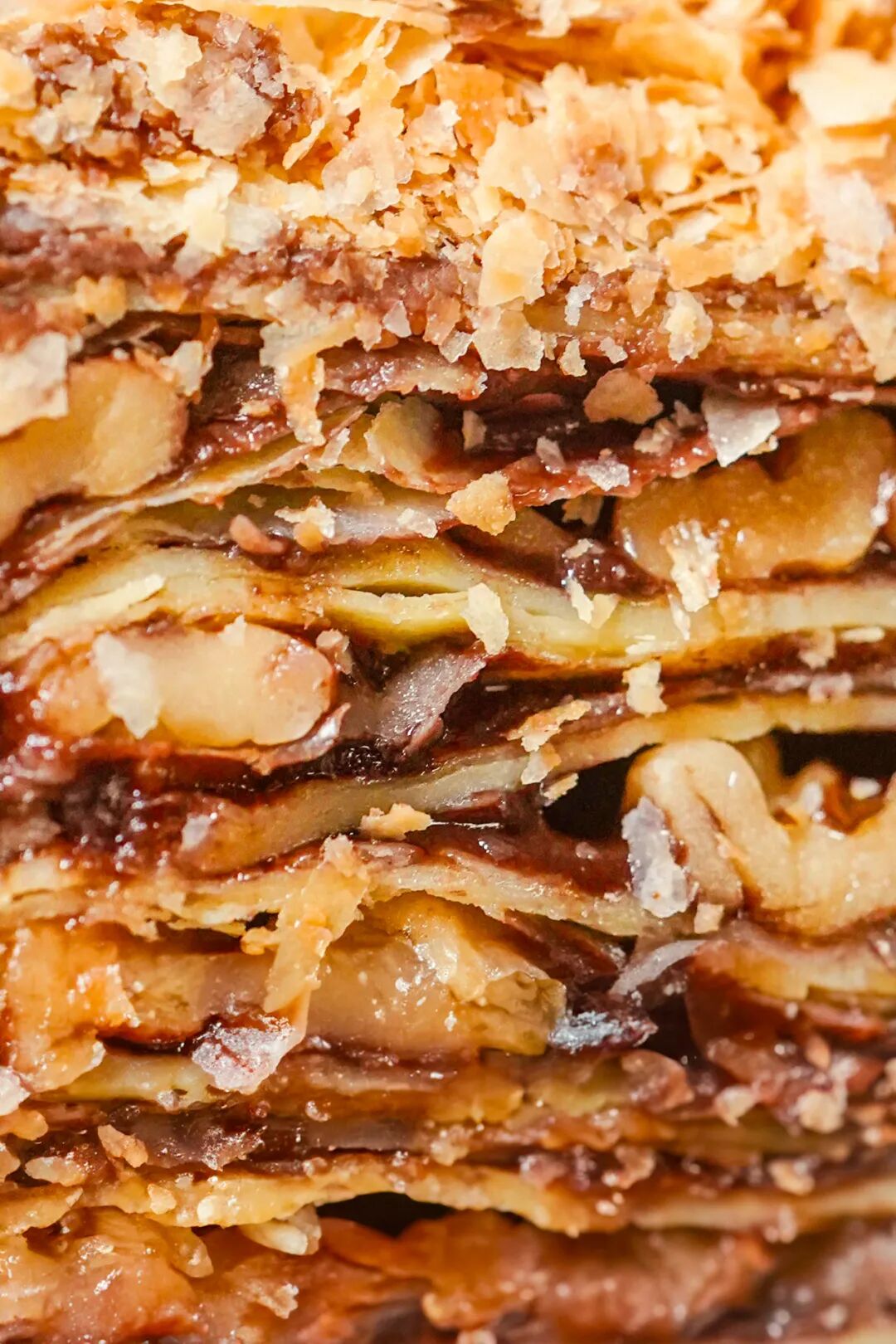 西式糕点这一块儿,天津也有拿得出手的好货。上海人、武汉人,排队追捧的是巧克力哈斗,天津人最爱的则是巧克力拿破仑。天津的巧克力拿破仑又可以分为两派,一派是以“爱德顺”的为代表,层层酥皮夹着巧克力酱和核桃仁,用料扎实,满满当当,简直赶得上切糕;另一派则以“桂顺斋”的为代表,酥皮之间夹的是带核桃碎的巧克力蛋糕,抹上吉士酱,外表再浇一层巧克力壳。无论哪一派的“能量方砖”摆在你面前,不夸张地说,咬一口足能跑出二里地去。