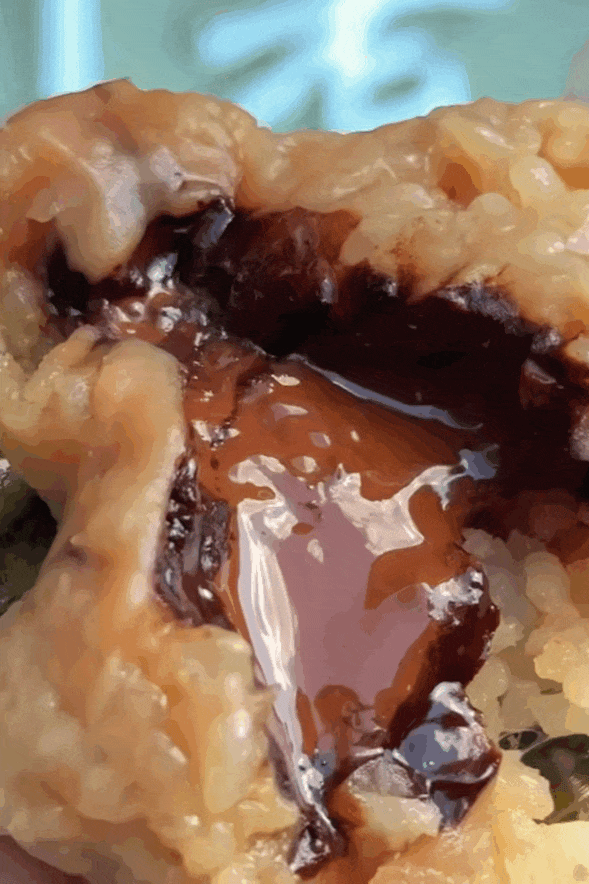 粽子……粽子?对,天津的粽子也有巧克力馅儿的,而且还很流行。端午节前后,中栗华、百瑞、源宗盛门前,买巧克力粽子的人能排大队。当然,粽子,自家包起来简便,很多人也就自己动手,准备粽叶、江米、巧克力糖(同样的,为了防止“露馅儿”,糖块表面可以用豆沙裹一层),一包一系,上锅一煮,便是一兜香甜。一只剥开,糯米莹白,当中一抹深褐色的馅料隐约可见,咬下去,是黏糯与丝滑的碰撞,是米香与可可香的交融。这听起来或许有些离经叛道,但在天津人看来,不过是又一次将心爱的巧克力,妥帖地安放进生活的又一个角落罢了。