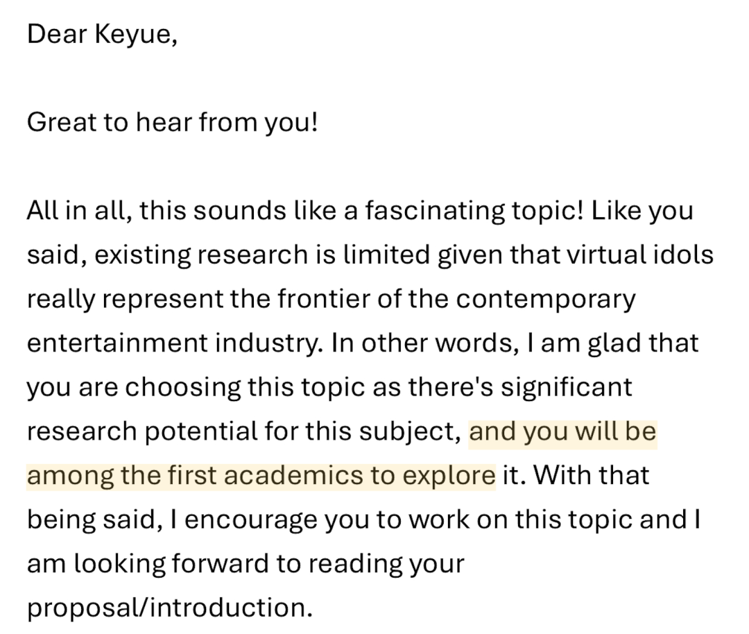 “我记得我当时期末论文,我想写的是关于虚拟偶像的一个研究。但是确实这个研究它是比较新的,就没有什么特别多的文献支持。我就发邮件问我那位老师能不能做这个,因为确实reference比较有限。然后他回复我的内容说的是:“这是一个非常好的题目。你如果现在做的话,就说明你是研究这个主题最前沿的researcher之一。”这句话给予我非常大的鼓励和自信。我是一个经常怀疑自己的人,如果老师对你说这样的话,我会真的觉得我有这样的信心去做。然后我也确实那一次作业做的还不错,所以我觉得这是我在岭南非常宝贵的一个记忆之一。”