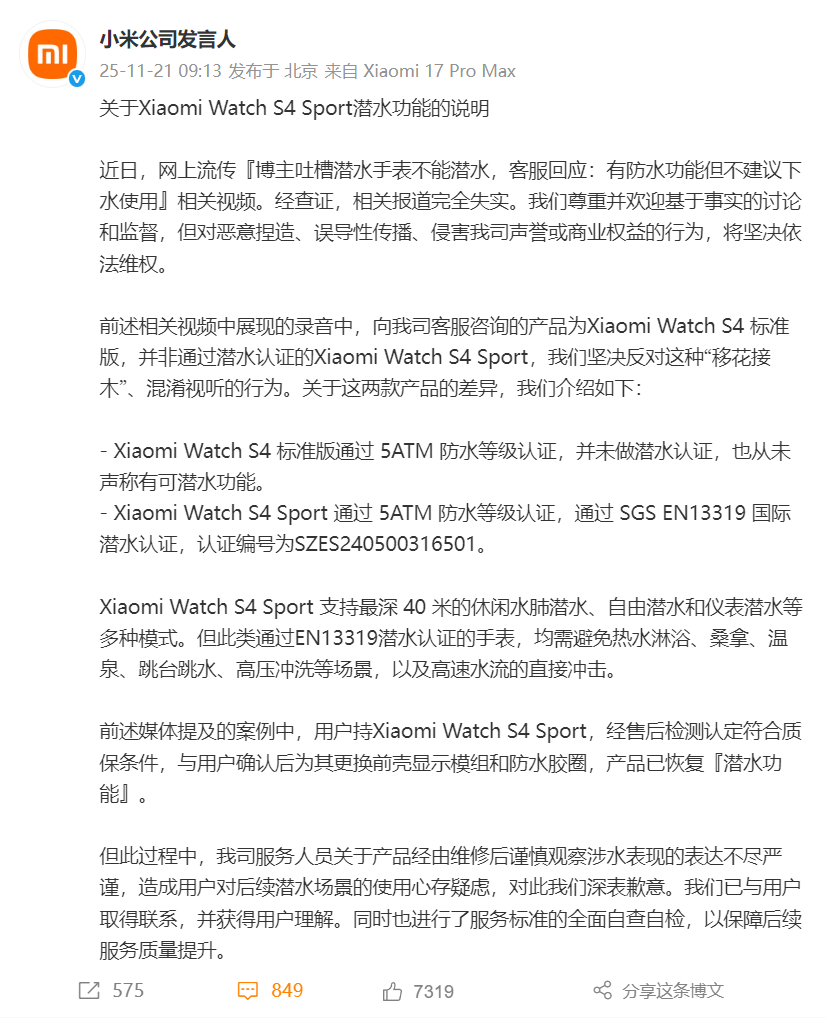 有些博主为了博眼球,把小米客服针对 Xiaomi Watch S4 标准版(未做潜水认证)给出的“支持防水,但不建议下水”这个回复,嫁接到了通过潜水认证的 Sport 版本头上,刻意带偏节奏。